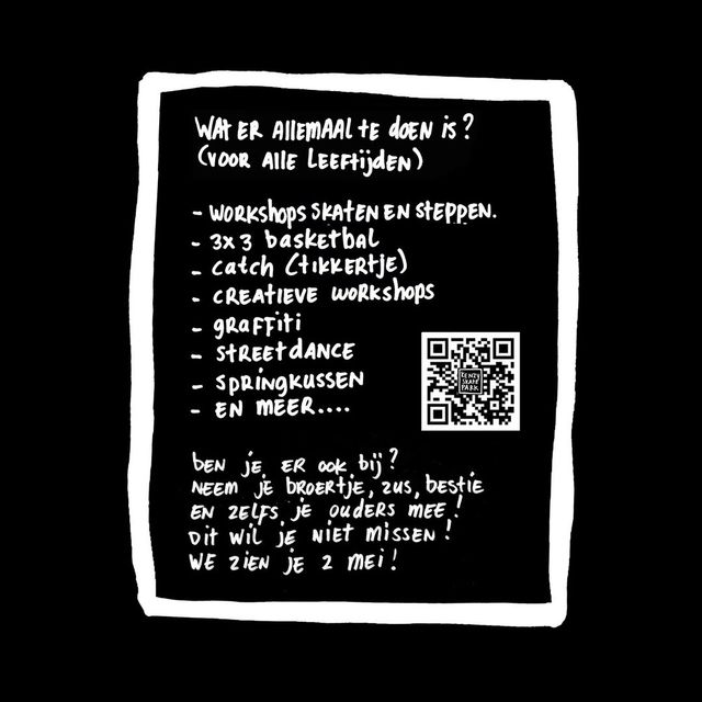 De opening is meteen een feest. Van 14.00 tot 17.00 uur staat de middag in het teken van sport, spel en creativiteit. De skateworkshop wordt verzorgd door Skeer Skateboards, een merk dat skateboarden betaalbaar en dicht bij de community wil houden. Met hun herkenbare zwart-witte stijl passen ze perfect bij de sfeer van het park. Ze nemen extra boards en bescherming mee, zodat iedereen — ook beginners — gewoon kan meedoen. Naast skaten zijn er ook workshops steppen, inlinen en BMX.