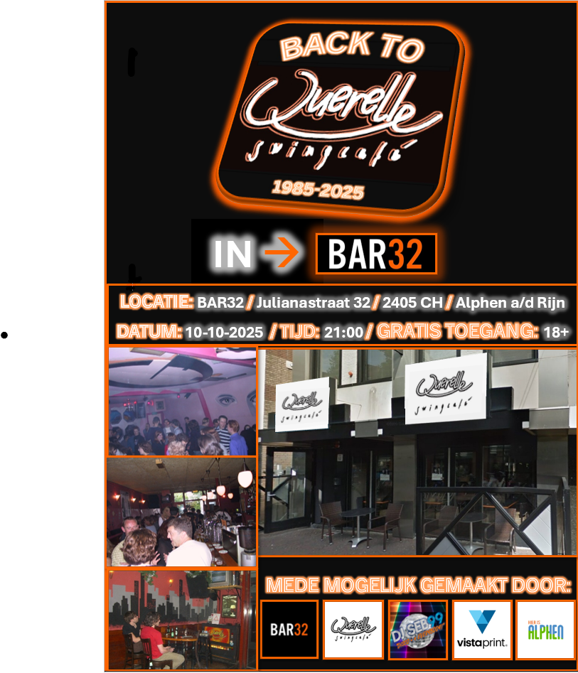 In 2016 sloot Swingcafé Querelle helaas haar deuren na 32 jaar. Gelukkig kregen wij al snel een leuke, nieuwe kroeg terug als opvolger: BAR32.